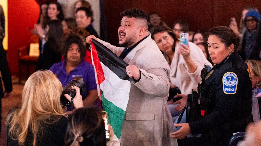 When his speech started, he was immediately heckled by a protester carrying a Palestinian flag and shouting, “How many kids have been killed?” Within seconds, the protester was drowned out by chants of “four more years” from the crowd, which lasted for about a minute.